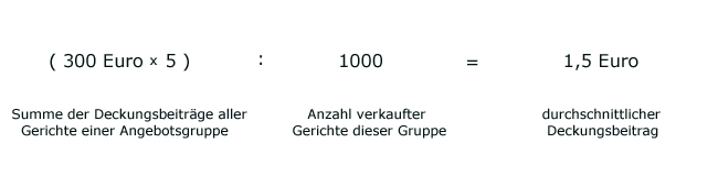 Ähnlich errechnet man den „Deckungsbeitrag“ bei der Speisekartendiagnose. Zunächst wird der Wareneinsatz vom Nettoverkaufspreis eines Gerichts subtrahiert. Übrig bleibt der Betrag, der zur Deckung der Fixkosten eines Betriebes beiträgt. Das sind alle Ausgaben für Personal, Pacht und Energieversorgung. Erst wenn diese Kosten gedeckt sind, können Betriebe Gewinne erzielen. Im nächsten Schritt wird auch beim Deckungsbeitrag ein Durchschnittwert errechnet. Das geschieht folgendermaßen: Die Deckungsbeiträge aller Artikel einer vorher festgelegten Kategorie (Hauptgerichte, Fleischgerichte, etc.) werden addiert. Das Ergebnis wird durch die Anzahl aller verkauften Gerichte dieser Kategorie geteilt. Angenommen, die untersuchte Angebotsgruppe besteht aus fünf Gerichten, deren Deckungsbeitrag jeweils 300 Euro beträgt. Die verkaufte Gesamtmenge liegt bei 1000. Dann sieht die Rechnung so aus: