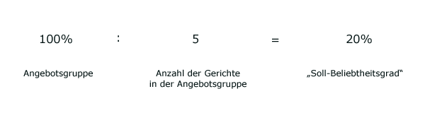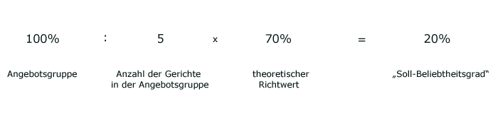 Was genau steckt hinter den Kennzahlen „Soll-Beliebtheitsgrad“ und „durchschnittlichen Deckungsbeitrag“? Und wie lassen sie sich bei der Speisekartendiagnose auch ohne unsere Excel-Tabelle errechnen? Der „Soll-Beliebtheitsgrad“ gibt an, wie gut sich ein Gericht im Vergleich zu allen Speisen einer Angebotsgruppe (100 Prozent) verkauft. Vergleicht man zum Beispiel fünf Gerichte – die Grenzen nach oben sind je nach individuellem Speiseangebot und gewählter Angebotsgruppe offen – sieht die Rechnung so aus: