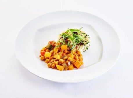3Gekochten Bulgur in einen tiefen Teller geben und mit dem Gemüsecurry servieren.