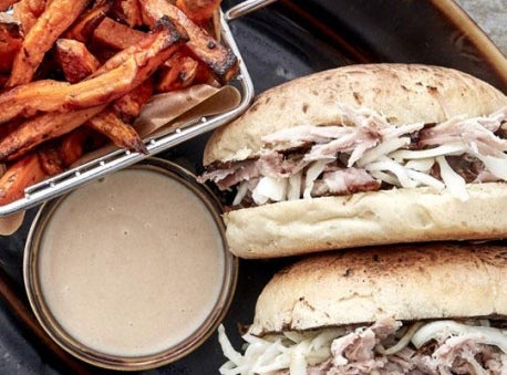 Burger mit Pulled Pork, mariniertem Weißkraut, Süßkartoffel-Pommes und "Ranch Dressing"