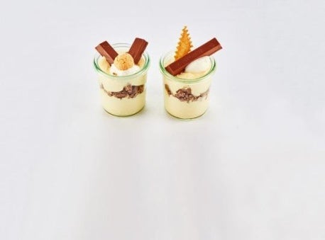 2Die KIT-KAT Riegel grob zerkleinern und in die Dessertgläschen portionieren. Die Creme darauf schichten.