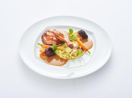 Entenkeule mit Pflaumen, Aprikosen und Weißkrautflan
