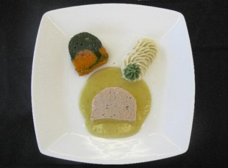 3Algenpulver in Wasser lösen und das erste Drittel der Farce damit färben. Den Rote Beete Saft in ein weiteres Drittel der Farce füllen und im Combidämpfer bei 94 °C Dampf 25 bis 30 Minuten pochieren.