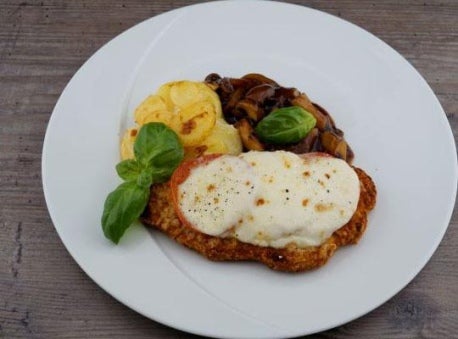 2Die Tomaten und den Mozzarella auf die Schnitzel legen und gratinieren. Die Austernpilze und Champignons in Butter anbraten.