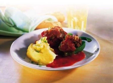 4Den Paprika den Stielansatz ausschneiden und die Kerne entfernen. Das Hackfleisch mit dem Reis gut vermischen und die Paprika mit dieser Füllung auffüllen.
