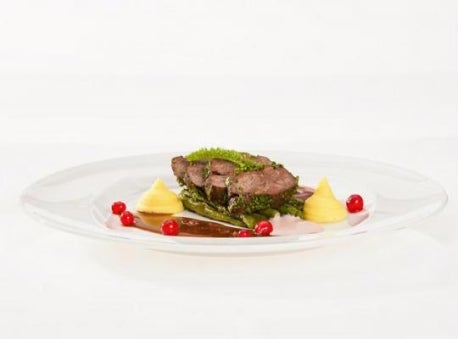 Geschmorte Lammhüfte mit Wiesenkräutern, Steckrübenpüreé und Preiselbeerschaum