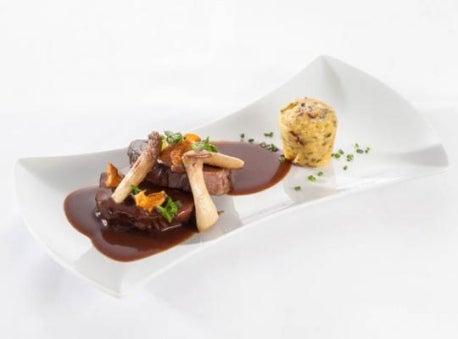 Geschmorte Wildschweinkeule in Sanddornjus, Semmel-Pfifferlingsflan
