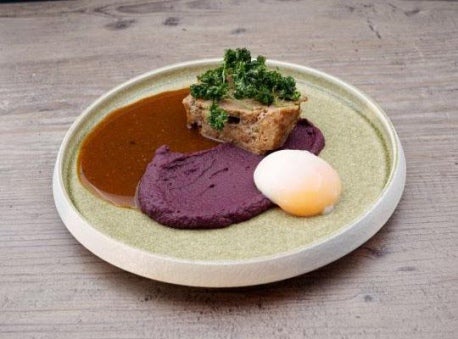 Lass dich von unserem köstlichen Hackbraten mit fermentierter Pfeffersauce, Onsen Ei und lila Karottenpüree verführen!
