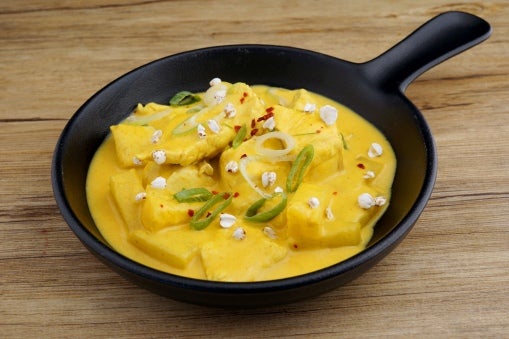 1THOMY Combiflex erhitzen. Curcuma und Zucker hinzugeben, bis es sich auflöst. Currypaste, Zitronensaft und Ananassaft hinzufügen.