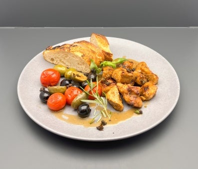 Kalbsragout mit Portweinjus, Oliven & Kirschtomaten – mediterran verfeinertes Schmorrezept für die anspruchsvolle Profi-Küche, serviert mit Baguette.