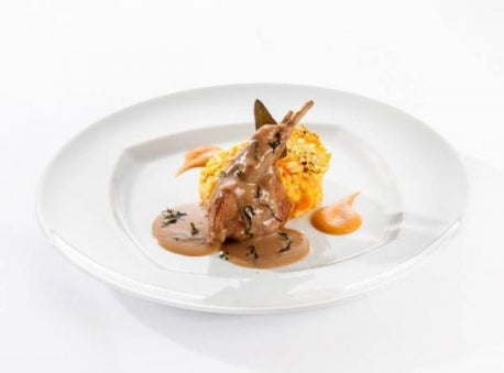 Kaninchenkeule in Salbeirahm, Kürbisrisotto, Espuma von getrockneten Tomaten