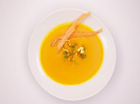 Karottensuppe mit Gartenkresse und Curry-Popcorn