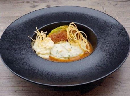 Krautwickel, veganes Hack, Zwiebelschaum, Kräuterkartoffelcreme