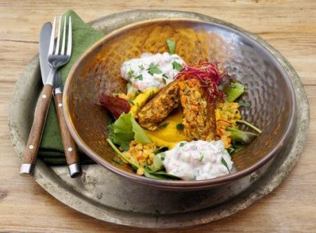 Linsentaler auf Kürbismousse, glasierte Linsen, Tomaten-Gurken-Raita