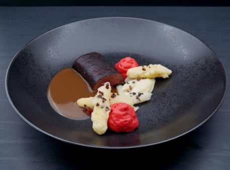Mai Bock, Schokoladensauce, gebackener Kakao Crue Spargel, Rote Beete Butterschaum