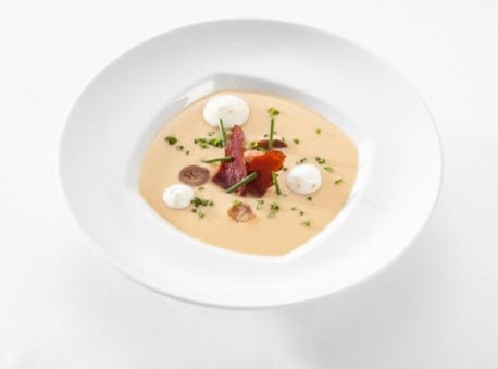 3Schmand glatt rühren und in einen Sahnesyphon geben. Diesen mit 2 Gaspatronen bestücken. Die Suppe mit dem Schmandschaum garnieren.