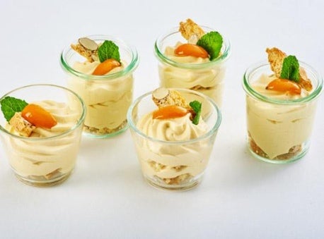 3Das Cantuccinigebäck auf hohe Dessertgläser verteilen. Die aufgeschlagene Orangen-Sanddorn-Mousse auf die Cantuccinisplitter dressieren.