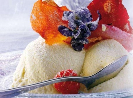 5Von der Mascarpone Creme zwei Nocken ausstechen, auf einem Glasteller anrichten und mit den kandierten Blüten garnieren.