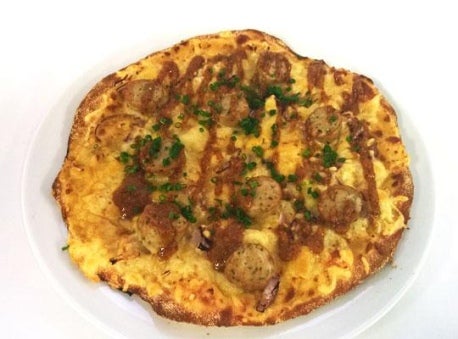 Nach dem Backen Schnittlauch und süßer Senf auf die Pizza geben.