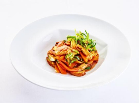3Putenbrust aus der Pfanne nehmen und nacheinander Zwiebeln, Karotten, Paprika und Champignons im Bratansatz anbraten. Mit der Tomaten-Kokossauce auffüllen.