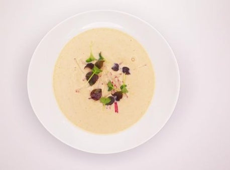 3Radieschenblätter hinzufügen, mit Kümmel abschmecken und laktosefreie Sahne zugeben. Alles mit einem Pürierstab fein pürieren.