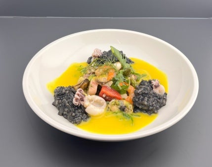 Risotto nero mit Meeresfrüchtesalat & gelber Beurre Blanc – modernes Signature Dish für die Profiküche, farbstark, aromatisch und hochwertig inszeniert.