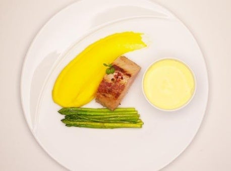 Rosa gebratener Kalbsrücken mit Kalamansi Hollandaise, grünem Thaispargel und Kartoffel-Safranpüree