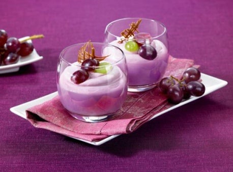 3Die Weintrauben mit Maraschino marinieren und die Rotweincreme vor dem Servieren damit garnieren.