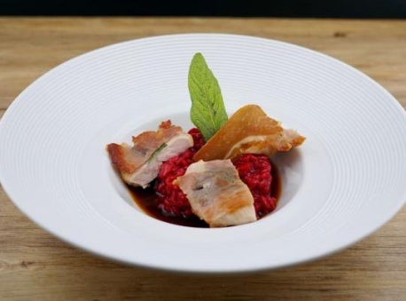 Saltimbocca vom Spanferkel mit rote Beete-Risotto und Marsalajus