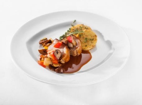 4THOMY COMBIFLEX erhitzen. Zwiebeln, Paprika und Champignons anbraten und mit Pfeffer und Salz würzen. Zum Anrichten auf das portionierte Fleisch geben.