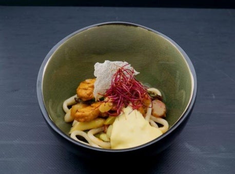 Spargel, Rhabarber aus dem Wok, Asia Hollandaise, vegetarische Filetstreifen