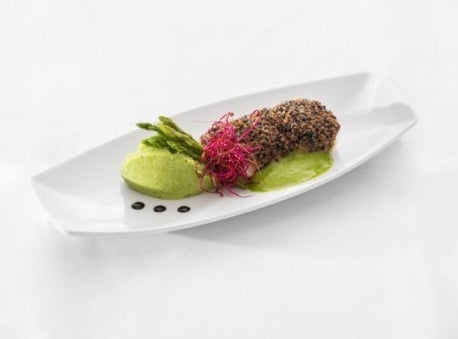 Steinbeißerfilet unter der Blutwurst-Majorankruste, grünes Spargelpüree, Schnittlauchschaum