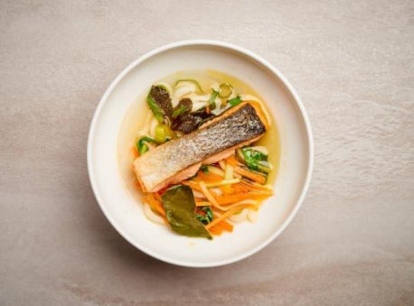 5Die heißen Udon Nudelnmit den gegarten Gemüsejulienne und dem Lachs in Suppenbowls anrichten. Mit heißer Brühe auffüllen.