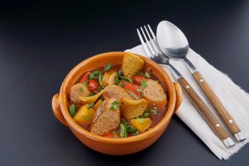 2Paprikapulver, Cayennepfeffer, Kümmel und Zucker zugeben und weiter dünsten. Kartoffeln und Gemüsepaprika zugeben und Wasser ablöschen. Kochen bis das Gemüse gar ist. Dann MAGGI feinen Sauce zu Braten und SOLIS Tomatensauce pulpig dazu geben. Die GARDEN GOURMET® Sensational™ Sausage- stücke zugeben und 5 Minuten kochen. Anschließend mit Salz abschmecken.